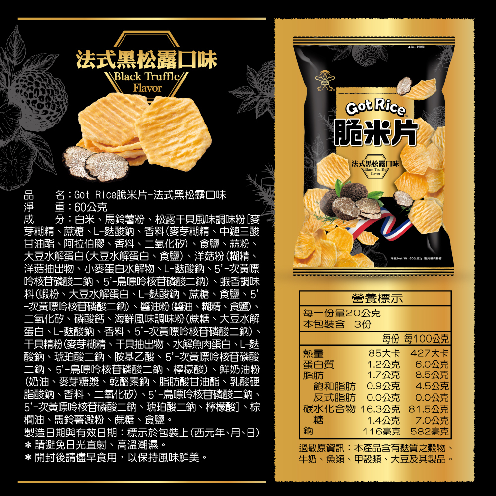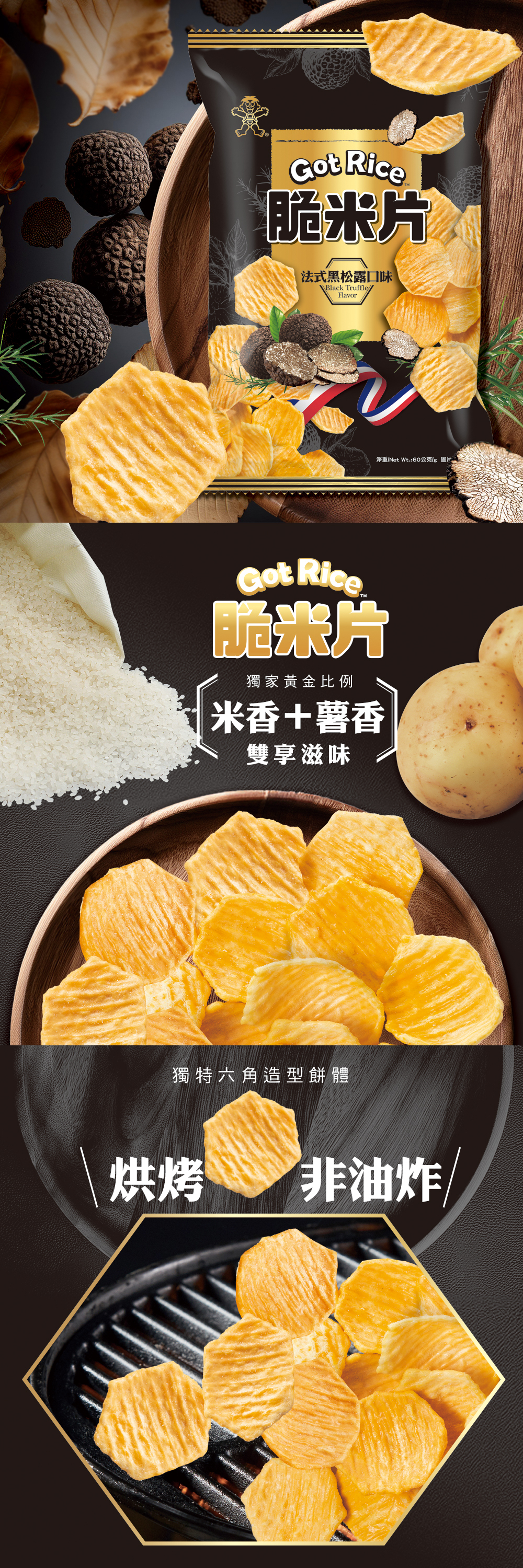 嚴選台灣米+馬鈴薯粉製成,獨特熱風膨化工藝技術,烘烤非油炸,喀脆好滋味!