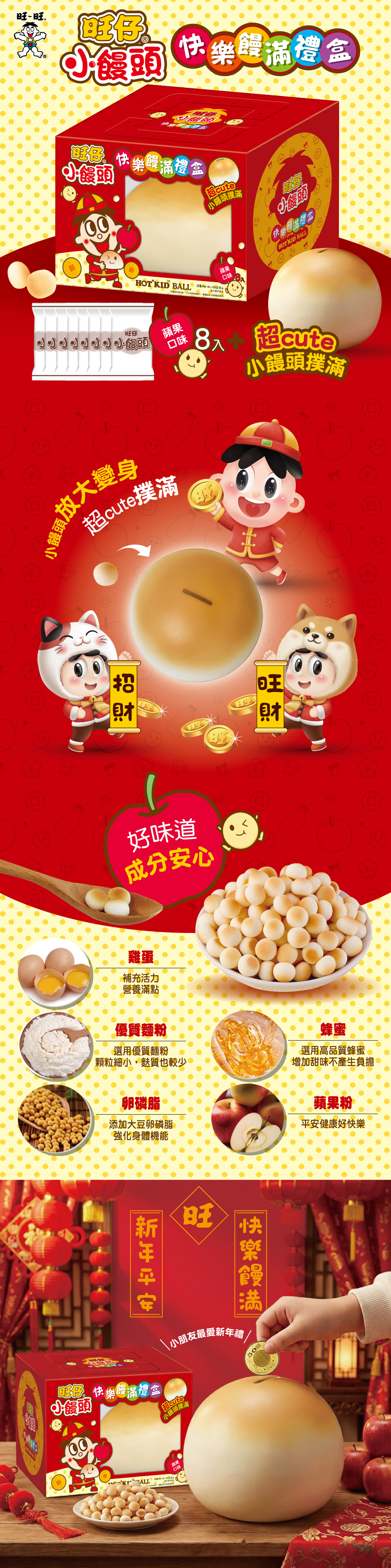 內含仿真造型撲滿乙個,完美還原經典小饅頭外型,療癒又可愛,陪伴你每一個時刻!搭配香甜酥脆的蘋果口味小饅頭,象徵平安吉祥,新年送禮大人小孩都愛不釋手!讓您快樂饅滿喔!