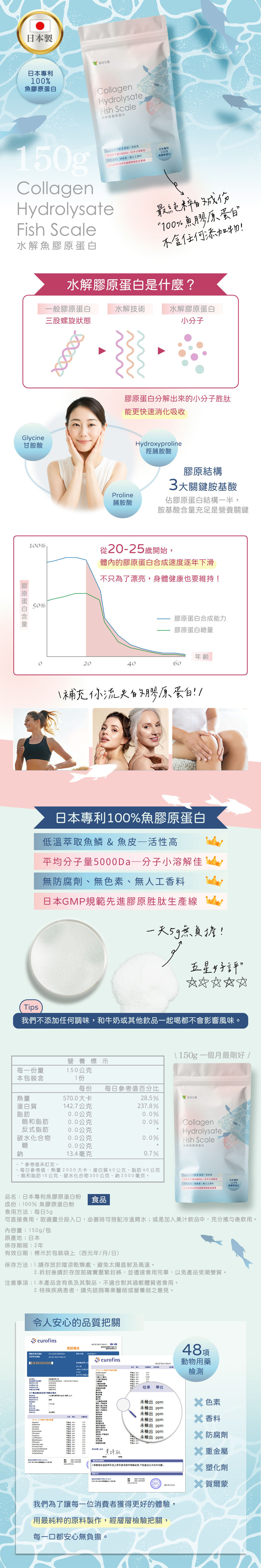 A:市售膠原蛋白來源主要有豬、牛、雞軟骨、魚皮、魚鱗...等,人體對魚鱗萃取的膠原蛋白有最佳的生物利用率,小分子魚膠原蛋白,高品質、高純度,不同於一般市售單分子量的膠原蛋白,使補充效果更為長久且穩定,吸收效率達到最佳。