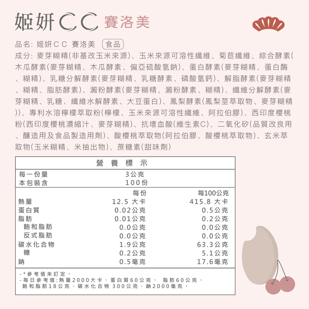 ⭐️商品成分:麥芽糊精、難消化性麥芽糊精、乳糖、綜合酵素(木瓜酵素(麥芽糊精、木瓜酵素、偏亞硫酸氫鈉)、蛋白酵素(麥芽糊精、蛋白酶、糊精)、乳糖分解酵素(麥芽糊精、乳糖酵素、磷酸氫鈣)、解脂酵素(麥芽糊精、糊精、脂肪酵素)、澱粉酵素(麥芽糊精、澱粉酵素、糊精)、纖維分解酵素(麥芽糊精、乳糖、纖維水解酵素、大豆蛋白)、鳳梨酵素(鳳梨莖萃取物、麥芽糊精))、專利水溶檸檬萃取粉(檸檬、難消化性麥芽糊精、阿拉伯膠)、西印度櫻桃粉(西印度櫻桃濃縮汁、麥芽糊精)、抗壞血酸(維生素C)、二氧化矽(品質改良用、釀造用及食品製造用劑)、酸櫻桃萃取物(麥芽糊精、酸櫻桃萃取)、玄米萃取物(玉米糊精、米抽出物)、蔗糖素(甜味劑)